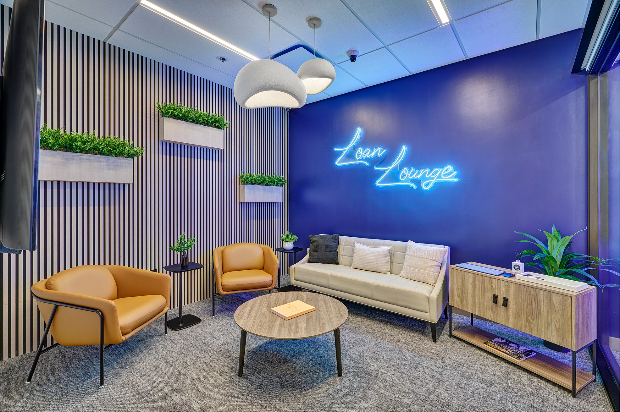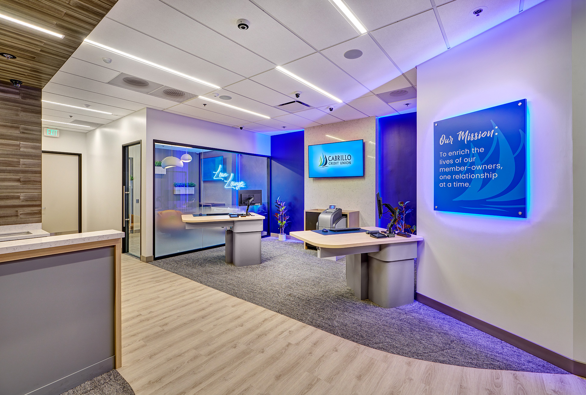 The completed branch demonstrates how thoughtful design can improve both efficiency and service delivery in smaller formats. A dedicated loan lounge enables private, remote consultations without requiring additional offices, while the compact teller and pod configurations maintain high service capacity. By aligning spatial design with operational strategy, Cabrillo now operates a branch that supports member satisfaction, staff productivity, and long-term adaptability within a constrained footprint.